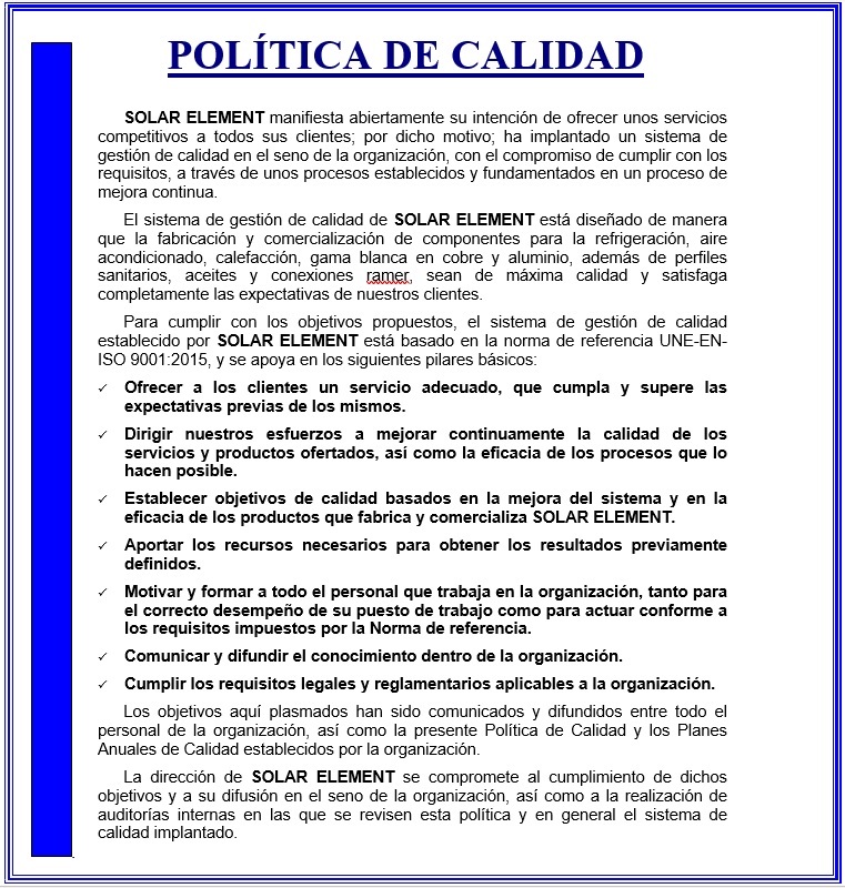 Política de calidad - Solar Element 2020